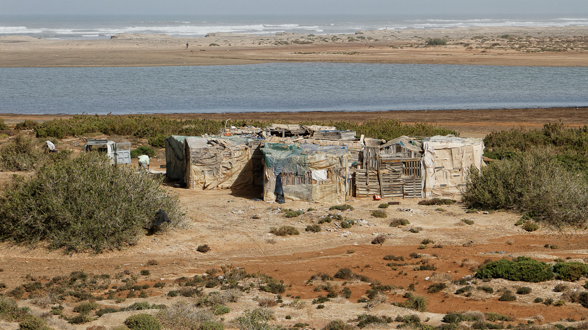 Leur gourbi est fait de planches, de tôles, de cartons, de bâches plastiques, de vieux filets et de broussailles. Du linge sèche accroché aux branches d’un arbuste épineux.
